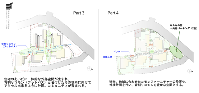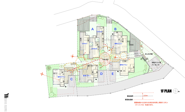 ①特徴:風致地区のルールから生まれる壁面後退で生まれる「敷地の余白」を利用し背割りコモン(フットパス)を設け、住民だけのプラベート路地を